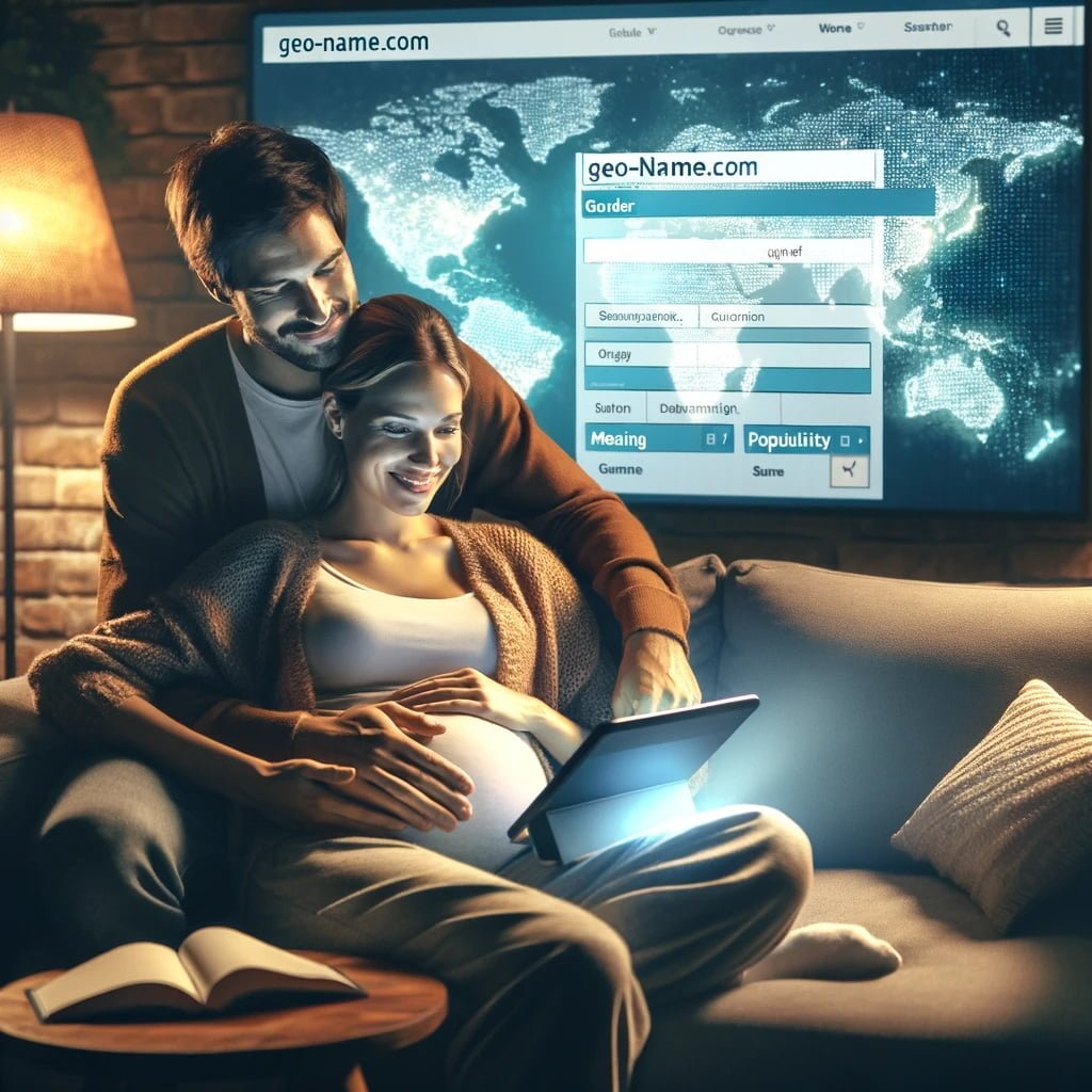 a pregnant woman and her partner are sitting on a couch, browsing through the ‘Geo-Name.com’ website on a tablet. The website interface features a search bar and filters for gender, origin, meaning, and popularity of baby names. In the background, a large, clear, and detailed world map is visible, emphasizing the global variety of names. The couple should be depicted in a warm, affectionate pose, smiling as they engage in choosing a name for their baby. The lighting should be soft and welcoming, adding to the intimacy of the moment.